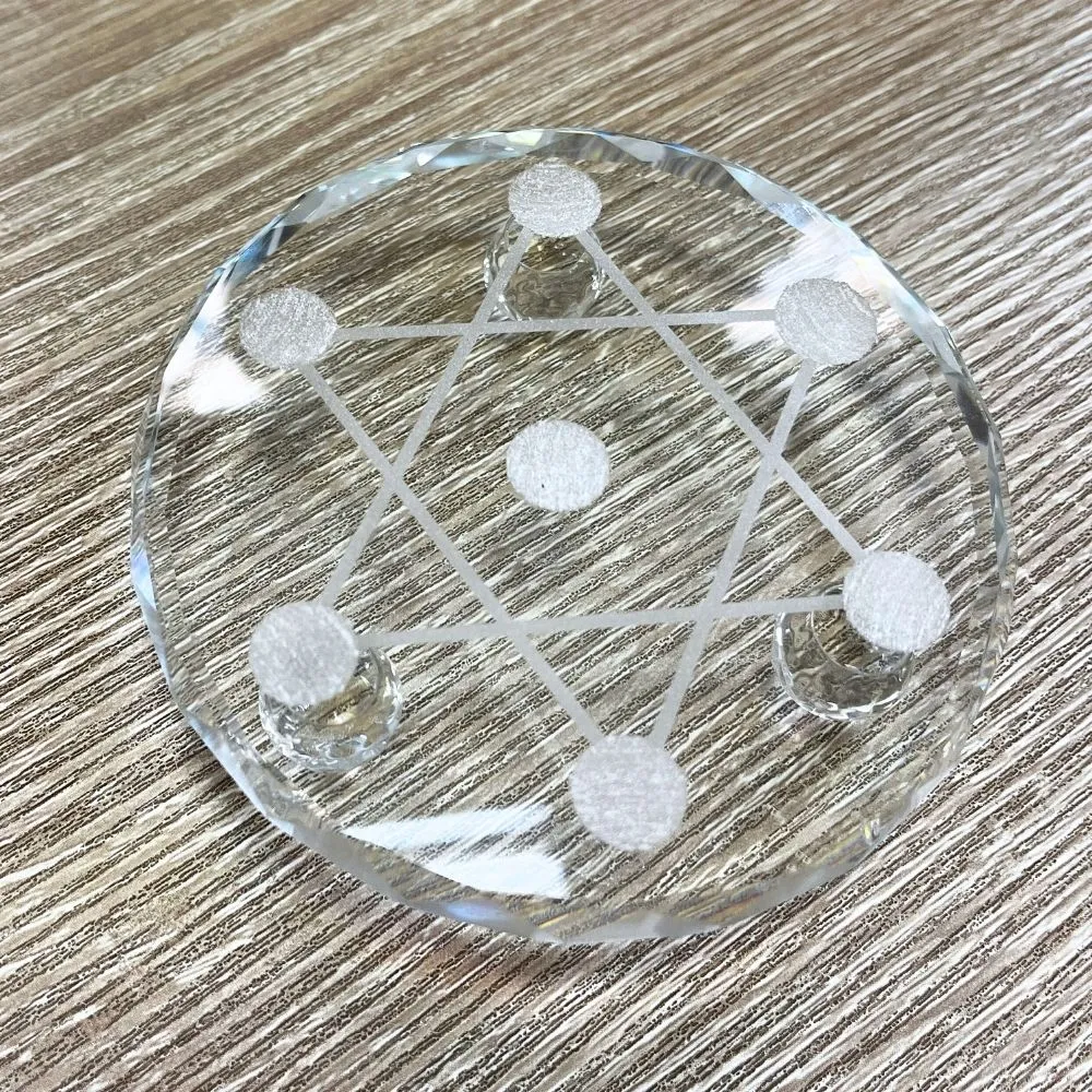 Fabricada en vidrio transparente y resistente, su superficie superior viene finamente grabada y ligeramente cóncava, lo que permite colocar esferas, corazones de piedra o pequeñas piezas rituales sin que se deslicen. Esta característica la convierte en un soporte ideal para trabajos energéticos, lectura de oráculos, armonización de espacios y decoración espiritual.