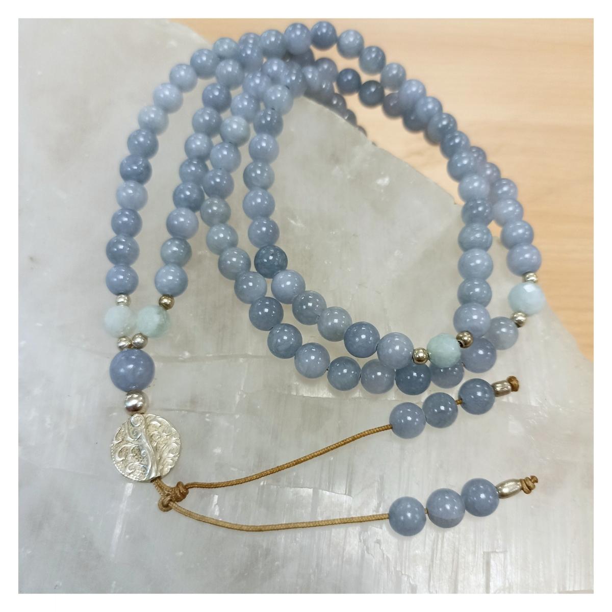 Este Japa Mala de Celestita y Agua Marina te ayuda a conectar con el reino angelical, te proporciona paz y relajación, alivia la ansiedad. Ambas piedras estimulan la comuncación y la clarividencia, abren el chakra laringeo, te ayuda a tener paz espiritual. Este Japa Mala ha sido elaborado de forma artesanal.