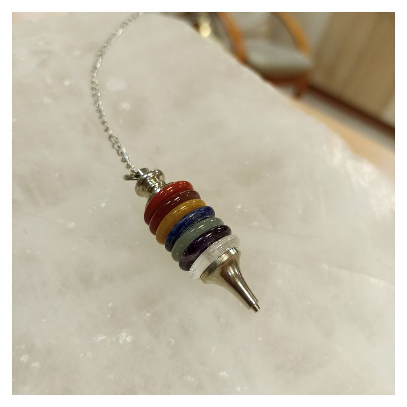 Péndulo de los 7 charkas, elaborado con 7 discos de Piedras naturales: Amatista, lapislázuli, Turquesa, Jade Aventurina verde, ojo de tigre, Jade Aventurina naranja y jaspe rojo.