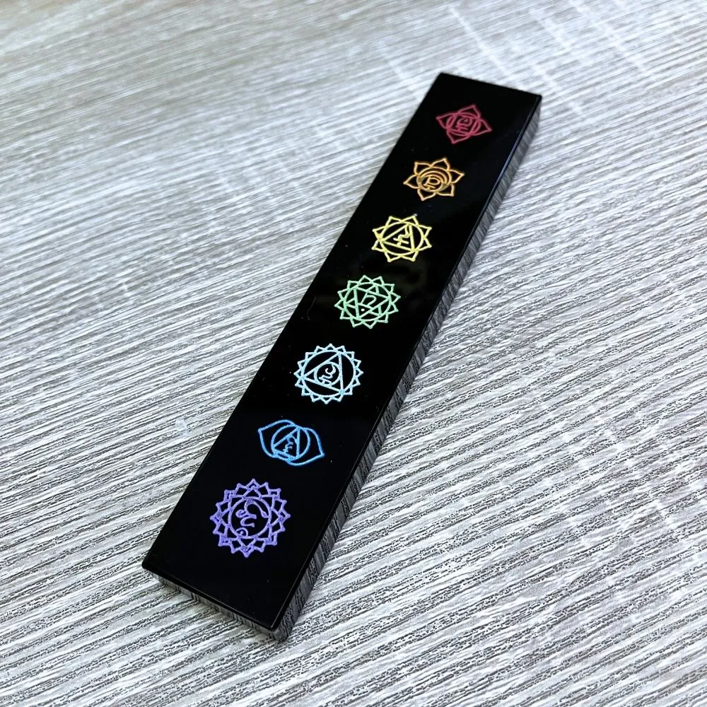 La Varita de Obsidiana Negra con Símbolos de los Chakras es una herramienta energética diseñada para armonizar cuerpo, mente y espíritu a través de la fuerza profunda de la obsidiana negra. Tallada con precisión y pulida hasta un brillo intenso, esta varita combina la solidez protectora de la obsidiana con la energía alineadora de los siete chakras, representados mediante símbolos grabados en relieve y tonos vibrantes que destacan sobre la superficie oscura del mineral.
