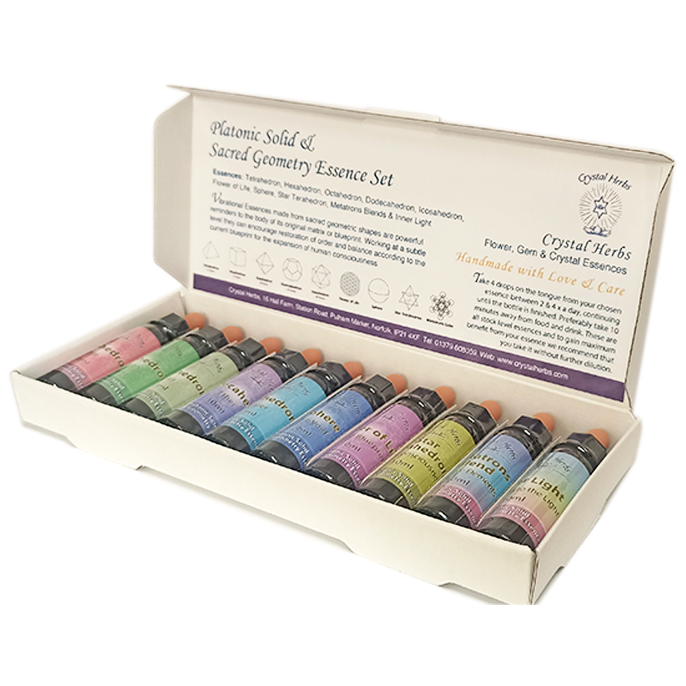 Las diez Esencias de Geometría Sagrada y Sólido Platónico están hechas de formas geométricas sagradas y son poderosos recordatorios para nuestro cuerpo energético de su matriz o modelo original. Trabajando a un nivel sutil pueden fomentar la restauración del orden y el equilibrio de acuerdo con el modelo actual para la expansión de la conciencia humana.
